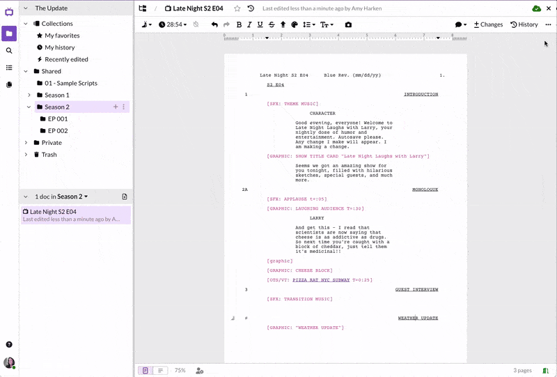 Whether you're taping a show in a studio, collaborating on screenplays, or making a video game, Scripto helps you do your best work and save time while you do it.